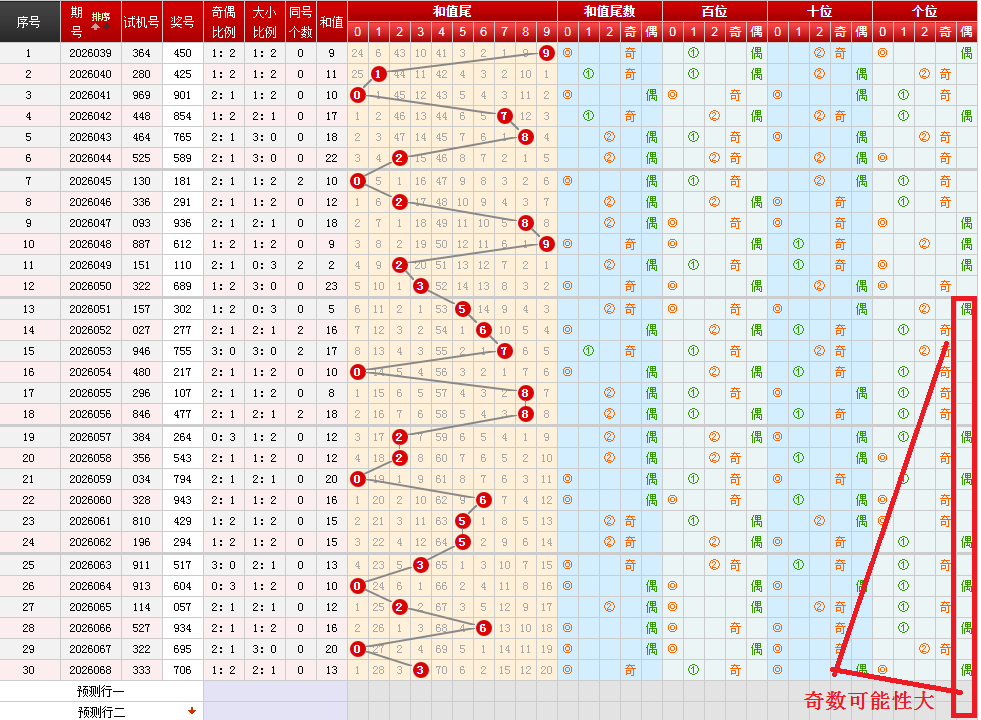 观察各位置奇偶开出趋势,本期选择奇数1-2个。