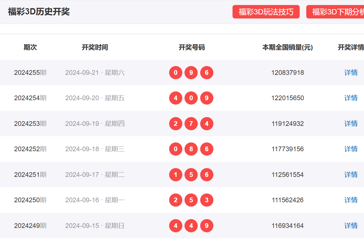 福彩3D上一期,开奖号码为096,形态为组六,奇偶比为1:2,012路数值表现为000,和值15,和尾5,跨度9。