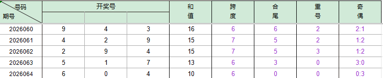 2026060期开奖号码943,我们可以看出近30期百位9出现3次,十位4出现2次(较061期减一),个位3出现3次。