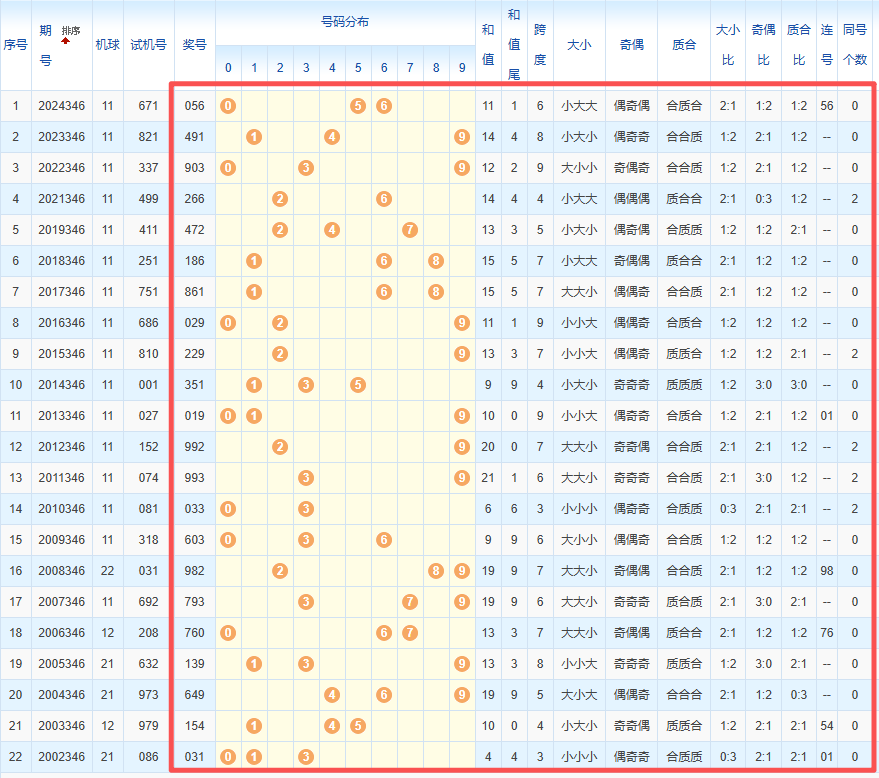 3、当个位开出0后下期开出:67994456,经统计0号出0次、1号出现0次、2号出现0次、3号出现0次、4号出现2次、5号出现1次、6号出现2次、7号出现1次、8号出现0次、9号出现2次。观察发现469号出现多次趋势好,本期可以考虑。