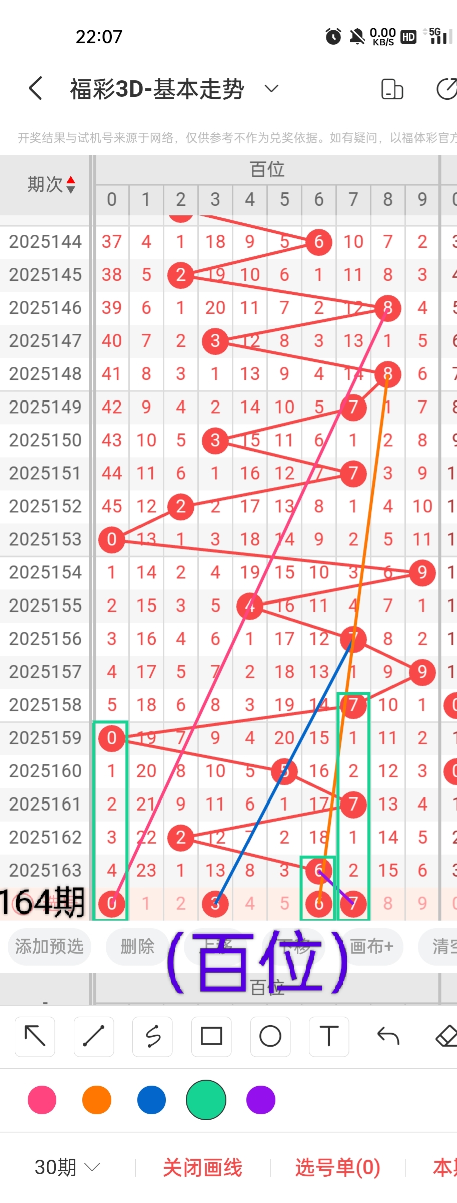 首先,小梁给大家分享一个福彩3D杀百位的小技巧,本期尾号乘以3加3后取个位杀本期百位,准确率高达95.36%。根据这个小技巧,本期杀百位:5。其次,我们根据图中画线的思路可以看出,号码0与前几期开出的号码呈斜三连的走位且呈隔四期回补的走势,跨度为6;遗落13期未出的号码3与前几期开出的号码呈斜三连的走位,跨度为3;号码6与前几期开出的号码呈直连回补的走位且呈斜三连的走势,跨度为0。然后,如图所示,号码7与前几期开出的号码呈斜连的走势且呈连续隔两期回补的走位,跨度为1。综上所述,小梁预测百位开出的号码为0、3、6、7。