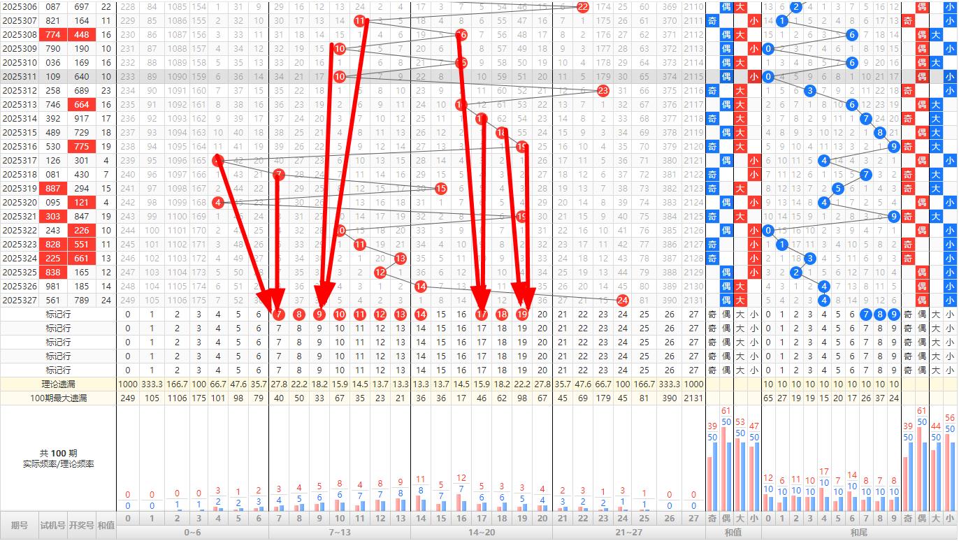 和值预判分析: 327期的开奖号码为789和值为24,这是一个相对较大的和值。在和值走势的分析中,注重和值的波动性和稳定性。考虑到近期和值的波动范围,可以预判329期的和值将走小。这样的预判不仅符合和值的波动性规律,也体现了和值的稳定性原则。和值预判为7.8.9.17.19..重点关注.7.9..尾.
