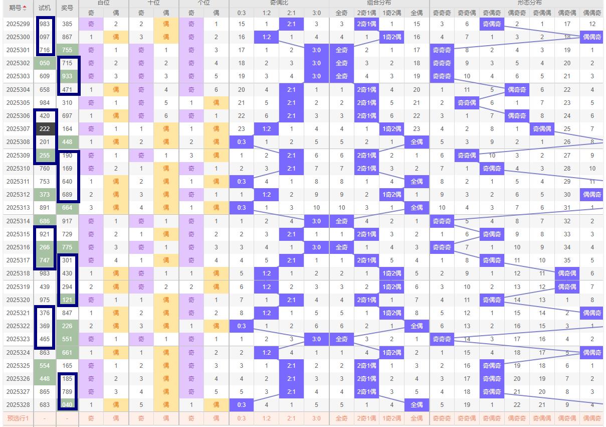 奇偶比例分析 328期的开奖号码为040;奇偶比为0:3,偶数占据主导地位。在奇偶比例的分析中,同样注重平衡原则。考虑到近期奇偶比的波动,可以预判329期的奇偶比例将继续保持平衡,即可能为2:1或1:2。这样的预判不仅符合历史数据的统计规律,也体现了奇偶比例在短期内的调整趋势,近十期奇偶比为14:16.所以福彩329期重点关注两奇一偶号码。