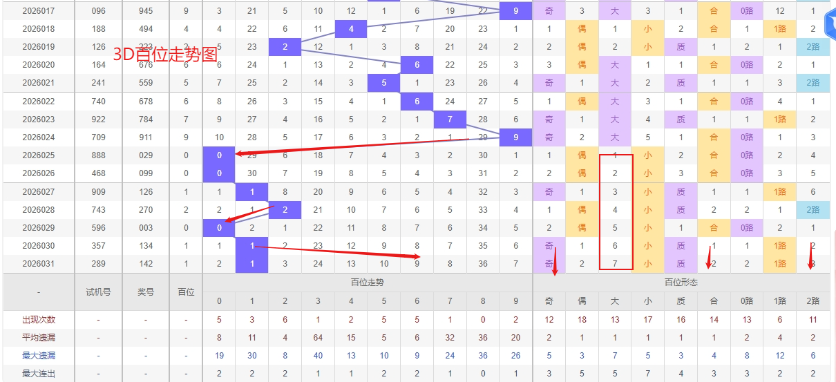 福彩3D百位分析:第2026031期百位开出号码1属于小奇数,从上面百位走势图上可以看出近100期大小比约为55:45奇偶比约为54:46。近期数据还是比较极端的符合文章开头介绍的求均衡规律非等量现象。但这种均衡不会持续最终会被偏态运行打破,然后循环往复。但短期内大小相差0点,大数过热小数有回补需求本期个人认为走小数的概率更高。上期百位落号“1”号球,在百位号码开出1路号码1后向大数方向走出0个振幅。那么通过分析上期百位落位号码分析,号码走出0个振幅,号码走为小奇数,开出1路号码1。通过对百位落号趋势来分析,百位号码落位前端,通过对近10期的走势来看百位号码大小交替频繁走3期大数又走2小数,近期3D百位走势分析,号码7与8已双双进入较深的冷态区间,其遗漏值均达到阶段性高位,从历史出号规律来看,百位冷号在经历长期沉寂后往往具备较强的技术性回补需求,两者之中至少有一码在近期解冻开出的可能性较大,值得作为重点追踪对象。与此同时,号码5近期表现十分活跃,呈现明显的热态走势,短期内热度尚未消散,仍需防范其惯性热出,避免因追冷而忽视热号的持续表现。我们在百位关注的重点在04567这5个号码球上,百位号码近期奇偶切换频繁,1号球码属于1路号码奇数,现奇数开出过多有向偶数的趋势。所以福彩3D第2026032期百位看04567