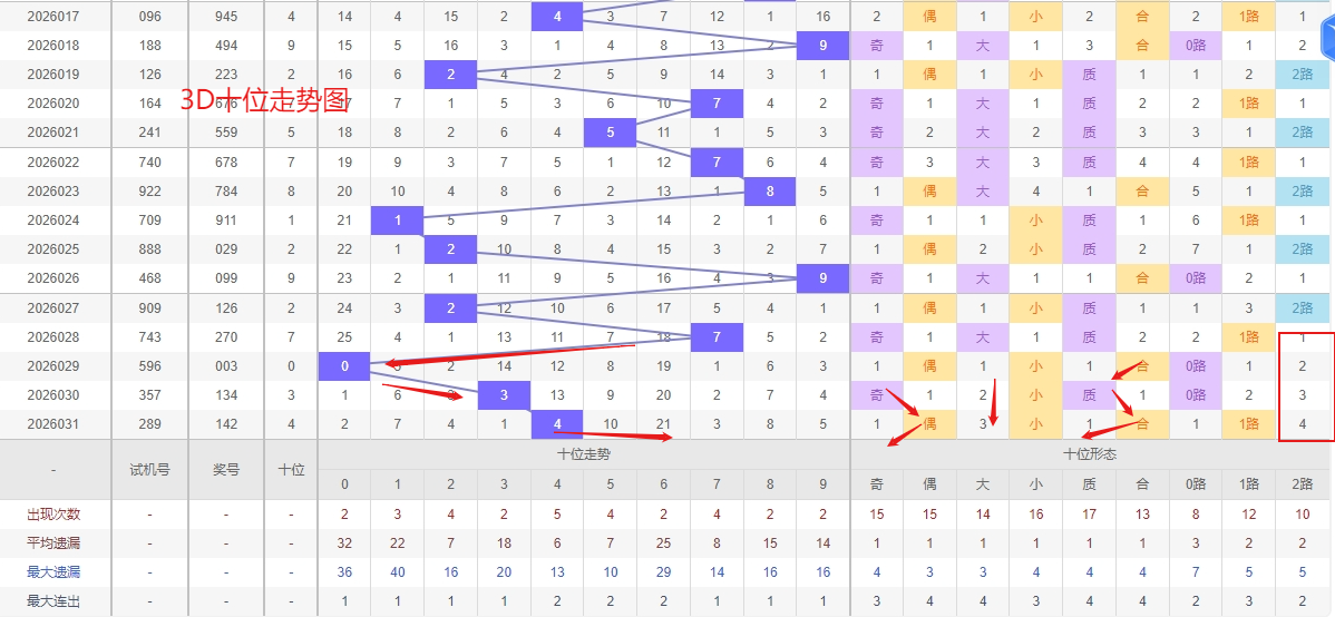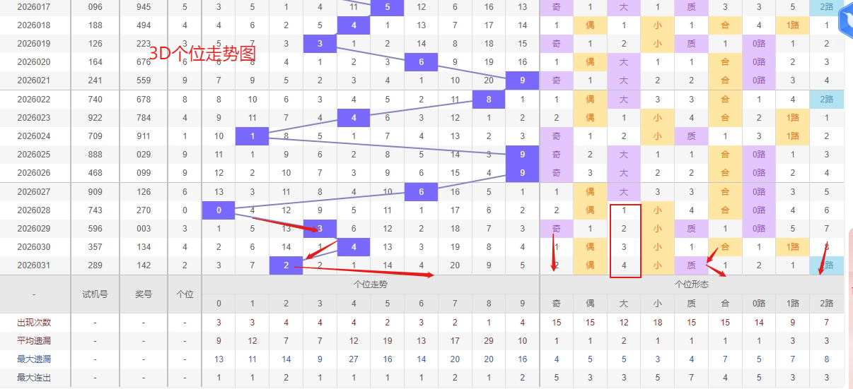 福彩3D个位分析:第2026031期个位开出号码2属于小偶数前端,从以上个位走势图中可以看出近100期的大小比约为48:52奇偶比约为54:46大小奇偶数据上有点差异有需求但不是太明显,不太好看这时就要借助连线走势和遗漏数据来帮助我们缩水号码。上期个位落号“2”小偶数2路号码球,号码开出了2振幅,连续多期的大振必被小振幅取代幅符合我们的预期,那么本期我们在个位考虑振幅走势走前依然要转变思路考虑大振幅,具体考虑(1-5)个振幅是我们主要的方向,那么在对个位落号情况进行系统的分析时我们可以明显的看到个位号码走势呈现大范围震荡,尤其是在号码的落位特点上表现的尤为突出,那么本期我们在个位分析时就要注意号码的风险,避免出现踏空。近期3D个位走势分析,号码4持续活跃,呈现明显的热态特征,出号频率高且间隔稳定,短期内存在延续热势的可能,需作为重点追踪对象。与此同时,号码8已遗漏较长周期,逐渐进入冷态区间,从历史轨迹看,个位冷号在经历深度遗漏后通常具备较强的技术回补需求,因此福彩3D第2026032期个位看好03458。