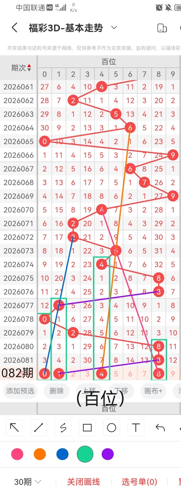 首先,小梁在这里给大家分享一个粉丝福利,给粉丝提供每期福彩3D杀一百位的号码:9;准确率高达95.36%。其次,小梁参照上图中画线的思路走位可以看出,号码0与前几期开出的号码呈隔三期回补的走势且呈斜三连的走位,跨度为8;号码1与前几期开出的号码呈隔四期回补的走位且呈斜连前后相互平行的走势,跨度7;号码4与前几期开出的号码呈斜三连的走势且呈隔七期回补的走位,跨度是4。然后,小梁参照上图中的画线思路走位可以看出,号码8前几期开出的号码呈直三连回补的走位且呈斜三连的走势,跨度0。综上所述,小梁推荐百位的号码是:0、1、4、8。