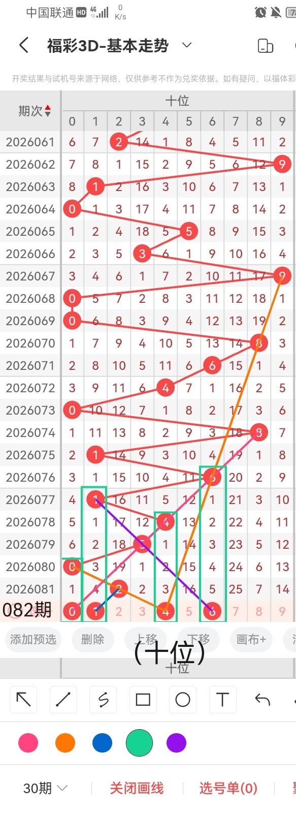小梁结合上图中画线的思路走势分析得出,号码0与前几期开出的号码呈斜五连的走位且呈隔期回补的走势,跨度为2;号码1与前几期开出的号码呈斜连的走势且呈隔四期回补的走位,跨度1;号码4与前几期开出的号码呈左右斜三连斜四连的走位且呈隔三期回补的走势,跨度是2;号码6与前几期开出的号码呈斜三连的走势且呈隔五期回补的走位,跨度4。综上所述,小梁推荐本期十位的号码为:0、1、4、6。