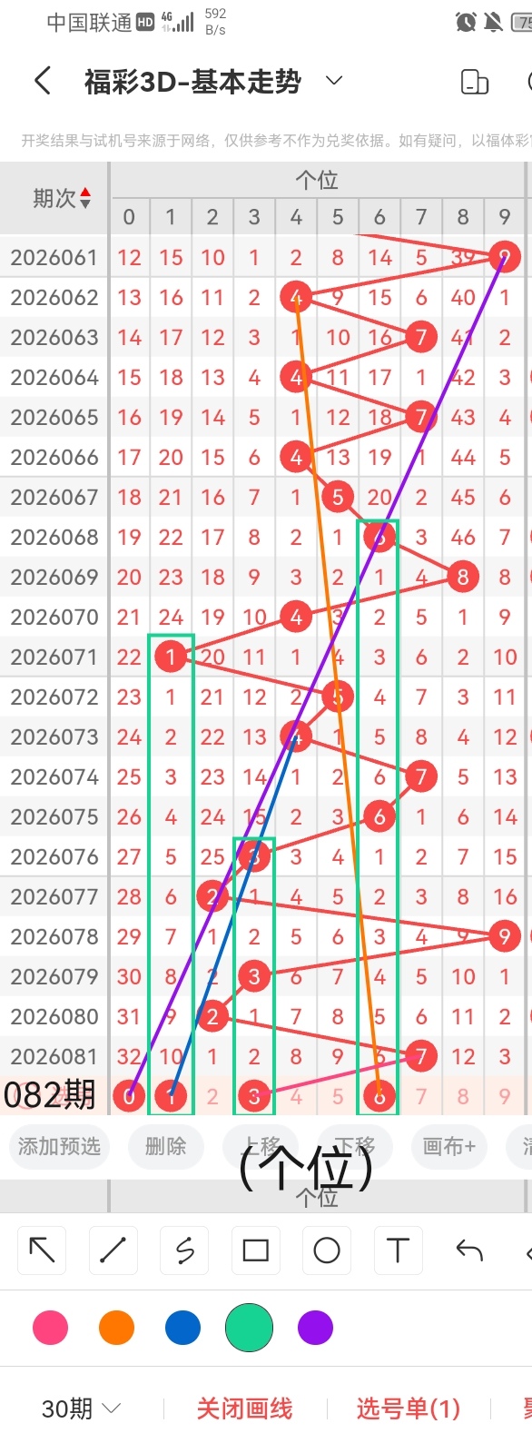 首先,为了感谢各位老板对小梁的关注和打赏,小梁特别提供一个杀个位的小技巧,同尾杀号法,准确率相还可以,但是要记住任何杀号都不能保证百分百准确的哦。小梁根据同尾杀号法,得知本期杀个位2。其次,小梁根据上图中的画线思路走位分析,遗落32期未出的号码0与前几期开出的号码呈斜三连的走势,跨度是7;号码1与前几期开出的号码呈斜三连的走势且呈隔十期回补的走位,跨度6;号码3与前几期开出的号码呈斜连的走势且呈连续隔两期回补的走位,跨度为4;号码6与前几期开出的号码呈连续隔六期回补的走势且呈斜三连的走位,跨度1。综上所述,小梁根据上图中画线的思路走势分析,推荐个位的号码是:0、1、3、6。