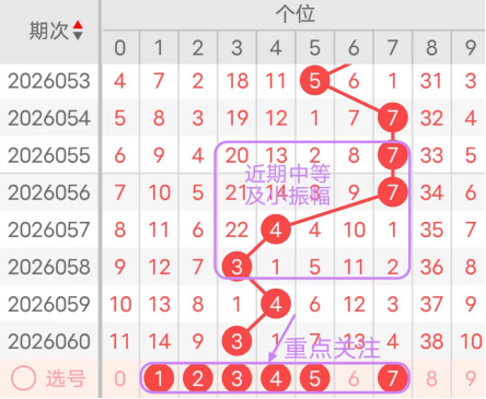近7期(054~060)开奖号个位号码球分别为7、7、7、4、3、4、3,开奖号与上一期走出的振幅分别为2、0、0、3、1、1、1。054期走出7号大数号码球,走出“2”的小幅度,055期走出7号大数号码球,走出“0”的小幅度,056期走出7号大数号码球,走出“0”的小幅度,057期走出4号中小数号码球,走出“3”的中小幅度,058期走出3号中小数号码球,走出“1”的小幅度,059期走出4号中小数号码球,走出“1”的小幅度,060期走出3号中小数号码球,走出“1”的小幅度;从近期振幅大小的走势及大小走势来看,整体振幅走在0~4之间较为适宜;结合走势图的整体及大小走势分析,本期个位应重点关注号码球为1、2、3、4、5、7。