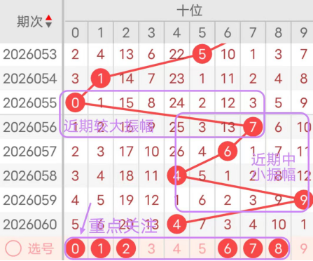 近7期(054~060)开奖号十位号码球分别为1、0、7、6、4、9、4,开奖号与上一期走出的振幅分别为4、1、7、1、2、5、5。054期走出1号中小数号码球,走出“4”的中小幅度,055期走出0号小数号码球,走出“1”的小幅度;056期走出7号大数号码球,走出“7”的大幅度,057期走出6号中大数号码球,走出“1”的小幅度,058期走出4号中小数号码球,走出“2”的小幅度,059期走出9号大数号码球,走出“5”的中大幅度,060期走出4号中小数号码球,走出“5”的中大幅度;从振幅大小及走势图的整体对应来看,中大振幅走在3~4之间较为适宜,中小振幅走在1~2之间较为适宜;结合走势图的上下对应及振幅大小分析,本期十位应重点关注号码球为0、1、2、6、7、8。
