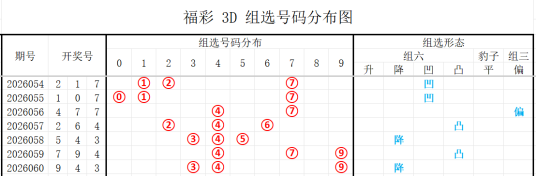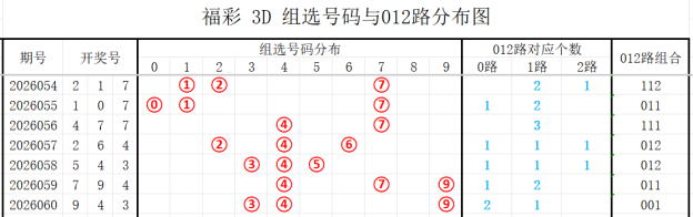 近7期(054~060)开奖号与012路组合分别为217(112)、107(011)、477(111)、264(012)、543(012)、794(011)、943(001),上期开奖号为001路组合,根据整体走势分析,本期看好的012路组合有:002、022、011,防012、222、001组合。