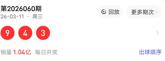 2026060期开奖号码为943,奇偶值为2奇1偶;大小值为1大2小;012路走势为001路;跨度为6跨;和值16点;组六形态。