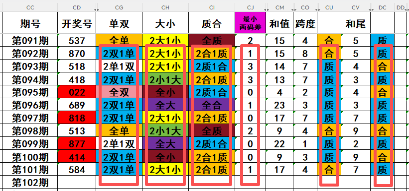 4,最近10天当中,最小两码差0开出4次,最小两码差1开出3次,最小两码差2开出1次,最小两码差3开出2次,
