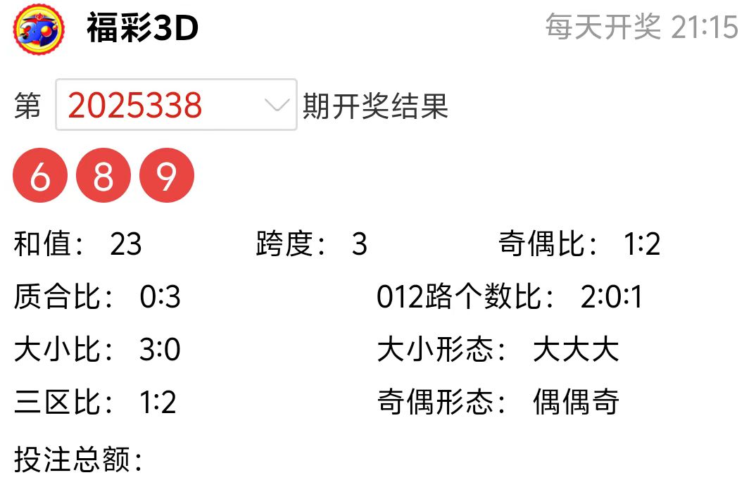 各位友友们大家好,我是博学说彩!每期给大家分享关于数字彩的我个人分析,常言道“命里有时终须有”,个人见解仅供参考!本文给大家分享的是福彩3D第2025339期开奖号码个人分析,若觉得有用请记得关注哦!
