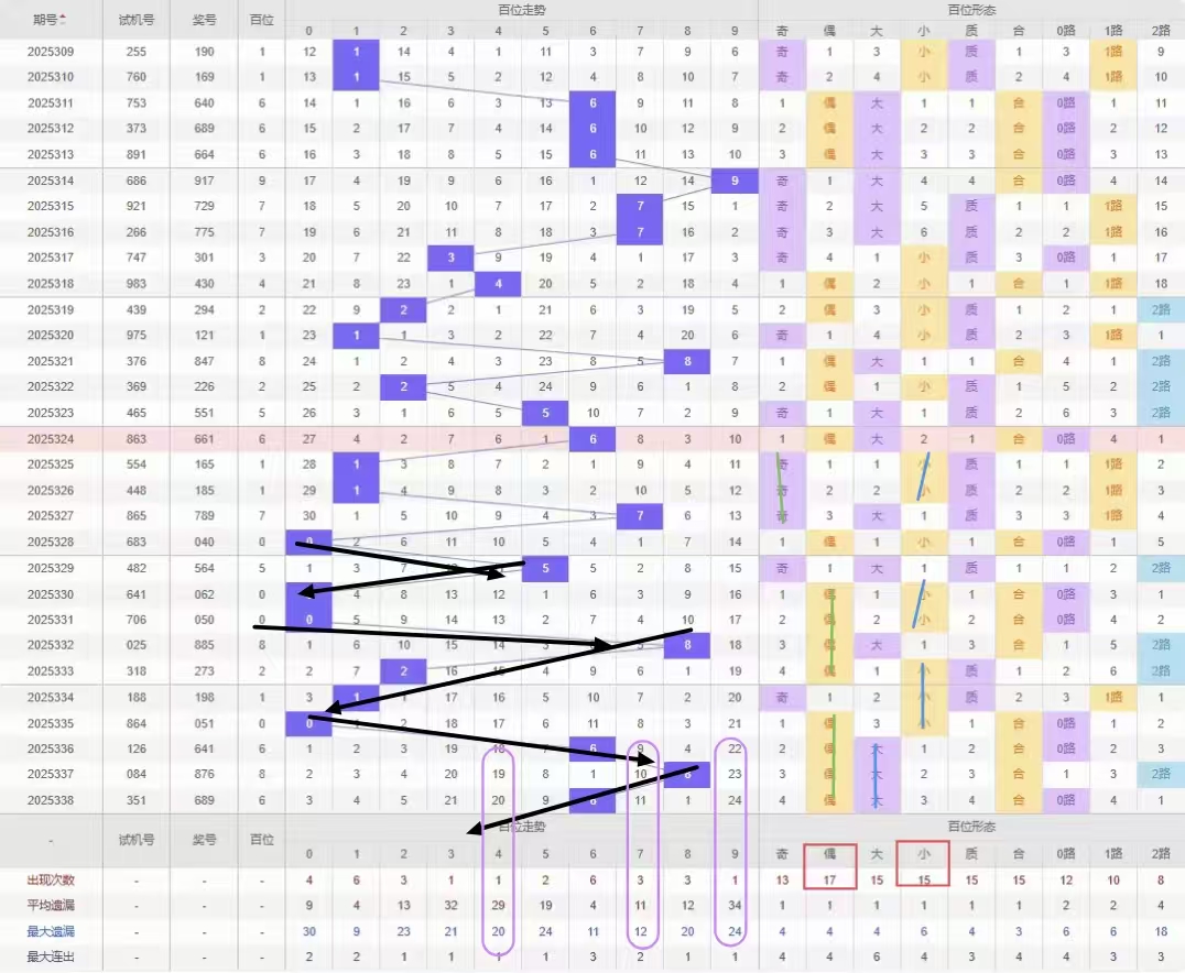 同理分析本期百位奇偶数形态,可以看到近15期开出奇数号5期偶数号10期,开出偶数号的概率是开出奇数号概率的2倍,上四期开出偶数号那么本期开出奇数的概率上升建议选择遗漏期数较大的奇数号。杀号建议定在所有偶数号,但偶数号4号都已经遗漏了10期以上建议开出防冷号开出。