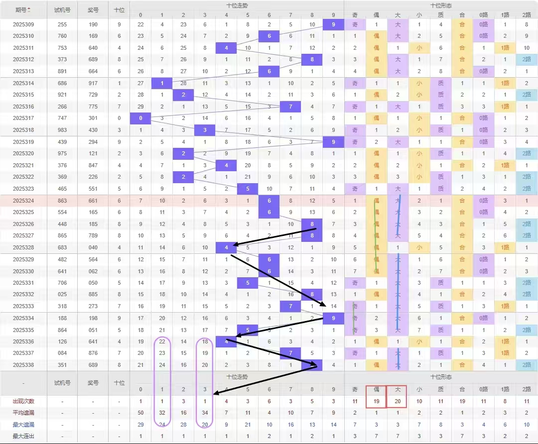 福彩3D第2025339期十位建议分析奇数偶数概率,如图所示近15期开出奇数号5期偶数号10期,开出偶数号的概率是开出奇数号概率的2倍,上期开出偶数号那么本期继续开出偶数号的概率较大建议选择遗漏期数较大的偶数号。建议杀号定在所有奇数号,但奇数号1号、3号都已经遗漏了10期以上建议开出防冷号开。