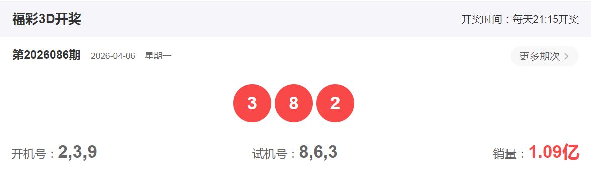 福彩3D2026年4月6日第086期开奖号码是382,组六形态,和值13,跨度6,奇偶偶,小大小