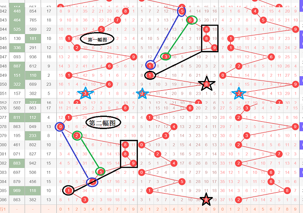 上期没有做视频走势分析,主要是没有看下太好的走势,这是一张大盘走势分析图,利用十位来分析全局的走势图,为了方便分析,我把图叠加了,分成了第一幅图和第二幅图,首先是在第一幅图中开出了黑颜色框889间隔两空黑颜色1,在百位同样也出现了黑颜色框889间隔两空1,在第一幅图中开出了绿颜色线条63,蓝颜色线条51,绿颜色线条63是两码差3,蓝颜色线条是两码差4,绿颜色线条是由大到小的排列方式,蓝颜色线条也是由大到小的排列方式,在第二幅图中百位绿颜色线条是25,25这两个数字也是差3,25这两个数字正好相反,是由小到大的排列方式,在第二幅图中蓝颜色线条是04,04这两个数字相差等于4,04这两个数字也是由小到大的排列方式,也就是说第一幅图中和第二幅图中,黑颜色框是坐标,绿颜色线条和蓝颜色线条属于对称,在第一幅图中出现了黑颜色星8,在第二幅图中也出现了黑颜色星8,文字表达可能不太清楚,大家可以观看上面的视频