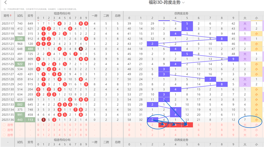 通过观察跨度及跨度属性走势可以发现:近10期内跨度小数号码出号后,下期容易连开小数号码,上期跨度开出了小数号码2,本期跨度大概率仍会开出小数号码,因此本期跨度应该继续考虑小数号码出号。结合上述跨度走势图来看,本期跨度仍然看好345等号码。