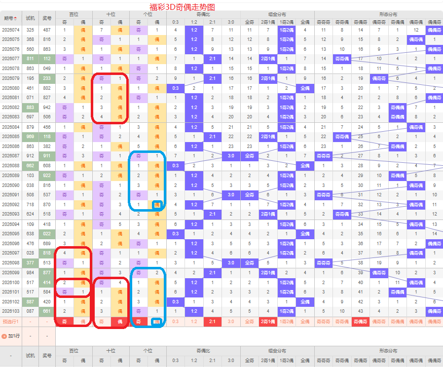 上期奇偶比是1:2,两偶的号码组合方式,从近五期的奇偶数出现情况看,奇数出现5次,偶数出现10次,奇数号码出现较少,本期侧重两奇的号码组合,侧重奇偶奇或奇偶偶的号码组合方式,根据奇偶形态做五码定位13579/02468/13579或13579/02468/02468
