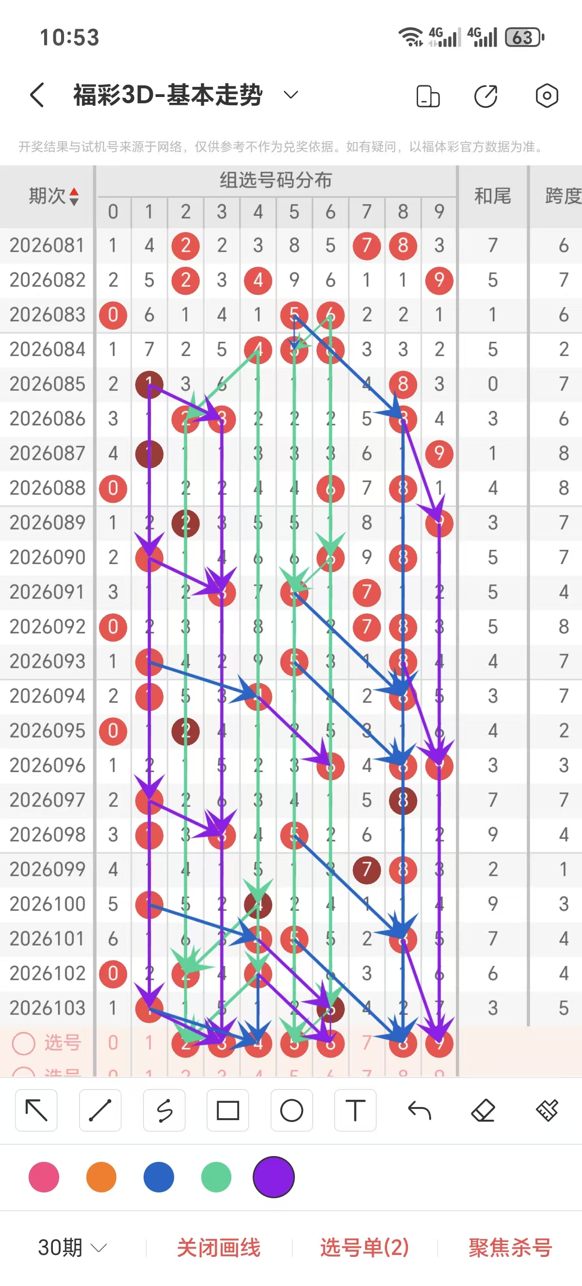 跨度通常情况下在五期之内重复一个跨度的概率很高,近五期重复了4的跨度,近五期跨度为1/3/4/4/5,近期1路的跨度较热,上期是0路的跨度,本期要侧重跨度以3/4/7跨为主的号码组合。可以从跨度方面选择相应的双胆码组合,双胆码的选取要根据近期和历史的走势进一步的分析选取。