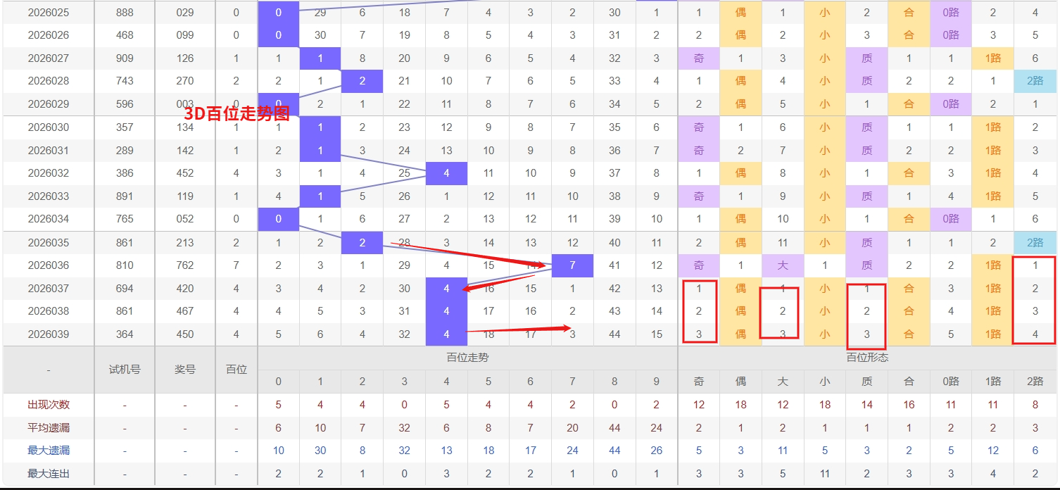 福彩3D百位分析:第2026039期百位开出号码4属于小偶数,从上面百位走势图上可以看出近100期大小比约为51:49奇偶比约为53:47。近期数据还是比较极端的符合文章开头介绍的求均衡规律非等量现象。但这种均衡不会持续最终会被偏态运行打破,然后循环往复。但短期内大小相差0点,大数过热小数有回补需求本期个人认为走小数的概率更高。上期百位落号“4”号球,在百位号码开出1路号码4后向小数方向走出0个振幅。那么通过分析上期百位落位号码分析,号码走出0个振幅,号码走为小偶数,开出1路号码4。通过对百位落号趋势来分析,百位号码落位前端,通过对近10期的走势来看百位号码大小交替频繁走2期大数又走3小数,近期3D百位走势分析,号码3和8已分别遗漏32期与44期,双双进入深度冷态。这种长期遗漏往往积累了较强的回补势能,从概率均衡与统计规律来看,冷号解冻开出的可能性正在显著提升,值得重点跟踪关注。与此同时,号码2在近期表现活跃,呈现明确的热号特征,热态惯性可能使其短期内继续保持强势,需防范其再次开出。我们在百位关注的重点在23568这5个号码球上,百位号码近期奇偶切换频繁,4号球码属于1路号码偶数,现偶数开出过多有继续向偶数的趋势。所以福彩3D第2026040期百位看23568。