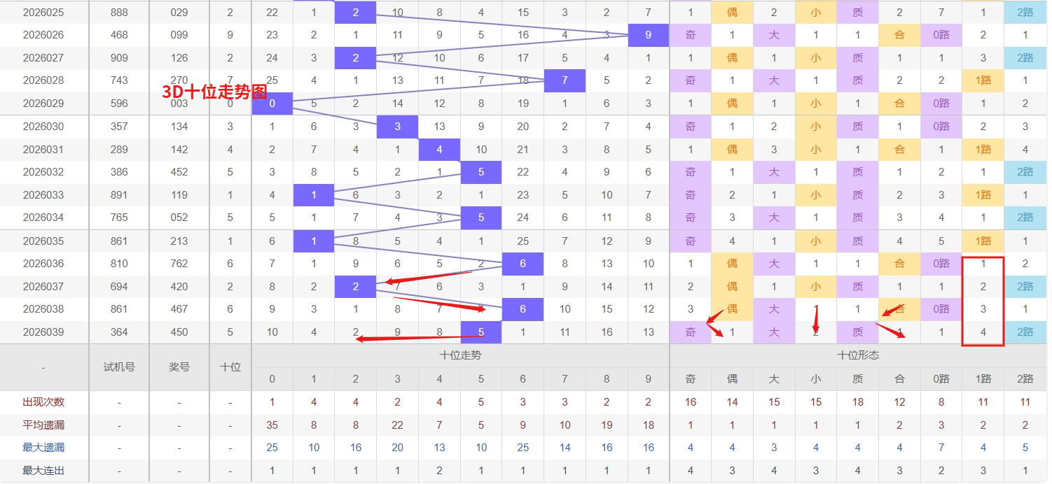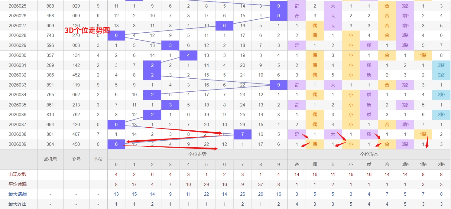 福彩3D个位分析:第2026039期个位开出号码0属于小偶数前端,从以上个位走势图中可以看出近100期的大小比约为48:52奇偶比约为55:45大小奇偶数据上有点差异有需求但不是太明显,不太好看这时就要借助连线走势和遗漏数据来帮助我们缩水号码。上期个位落号“0”小偶数0路号码球,号码开出了7振幅,连续多期的小振必被大振幅取代幅符合我们的预期,那么本期我们在个位考虑振幅走势走前依然要转变思路考虑大振幅,具体考虑(1-5)个振幅是我们主要的方向,那么在对个位落号情况进行系统的分析时我们可以明显的看到个位号码走势呈现大范围震荡,尤其是在号码的落位特点上表现的尤为突出,那么本期我们在个位分析时就要注意号码的风险,避免出现踏空。近期3D个位走势观察,号码5和8均处于明显的冷态区间,长期遗漏使得其回补势能不断累积。根据概率均衡与冷热交替的规律,此类冷号出现反弹开出的可能性正逐步增强,值得进行阶段性关注。与此同时,号码2在近期表现出强劲的热态特征,短期内仍具备持续开出的惯性,需防范其热度延续。整体而言,个位走势呈现典型的冷热对峙格局,因此福彩3D第2026040期个位看好24568。