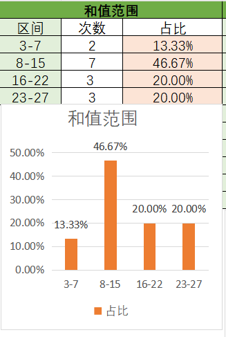 上期和值是12,处在8~15之间,其中8~15占比变大,16~22占比变小。目前是8~15占比最优,其次是16~2223~27,最后是3~7。本期看好和值在8~15之间,其次是16~22