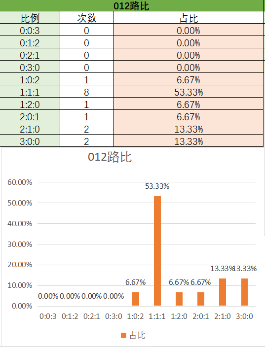 上期012路比是1:1:1其中1:1:1占比变大,0:0:3占比变小。近15期内,1:1:1是开出最多的,次之是3:0:02:1:0,最后是2:0:11:2:01:0:2总的看0最热门其次是1路,最后是2本期看好1:1:10:2:1