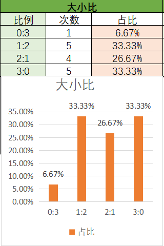 上期大小比为1:2,其中1:2占比变大,2:1占比变小。可以看到近15期内3:01:2优势最好的其次是2:1,最后是0:3。本期看好1:2开出,其次是2:1