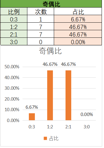 上期奇偶比为2:1,其中2:1占比变大,1:2占比变小。近15期内1:22:1优势最大,最后是0:3上期开了2:1奇偶比,本期看好1:2奇偶比的开出,其次是2:1