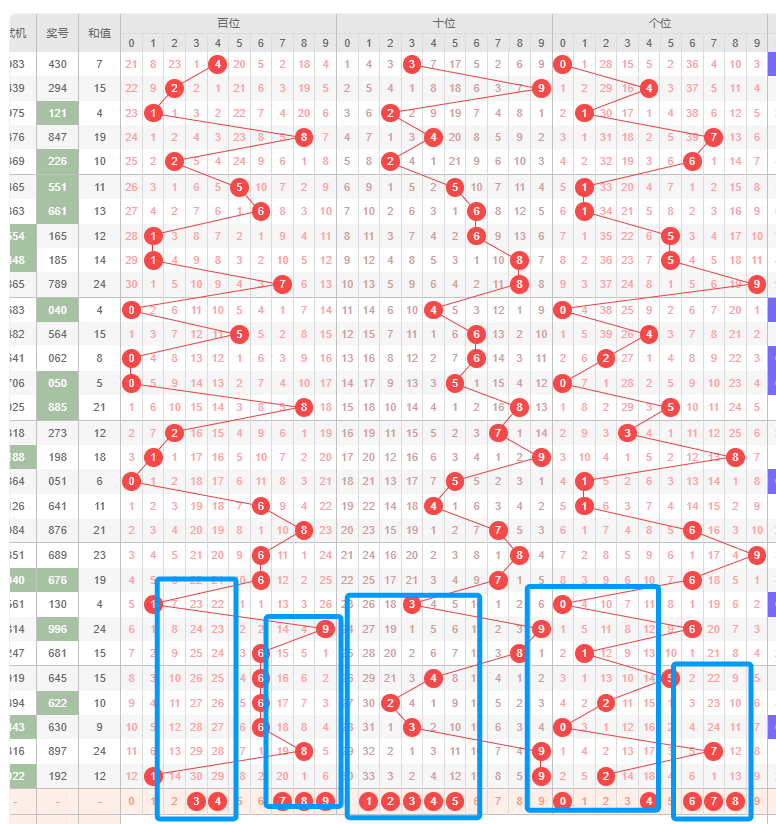 百位:百位开号上期开出了1号球,往前一期开的是8号球,上期的振幅为7,振幅变大;从012路走势来看,上期开了1路号码,本期看好0路号码,其次是2路,最后防2路;从奇偶数来看,上期开了奇数,本期还是看好奇数;从开号走势来看,看好往右走,看好7-8-9,其次是3-4