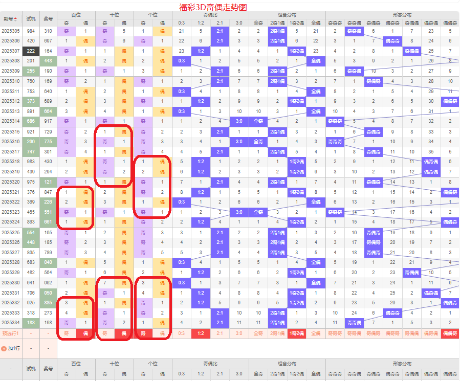 上期奇偶比是2:1,两奇的号码组合方式,从近五期的奇偶数出现情况看,奇数出现6次,偶数出现9次,奇数号码出现较少,本期侧重两偶的号码组合,侧重偶偶奇或奇偶奇的号码组合方式,根据奇偶形态做五码定位02468/02468/13579或13579/02468/13579