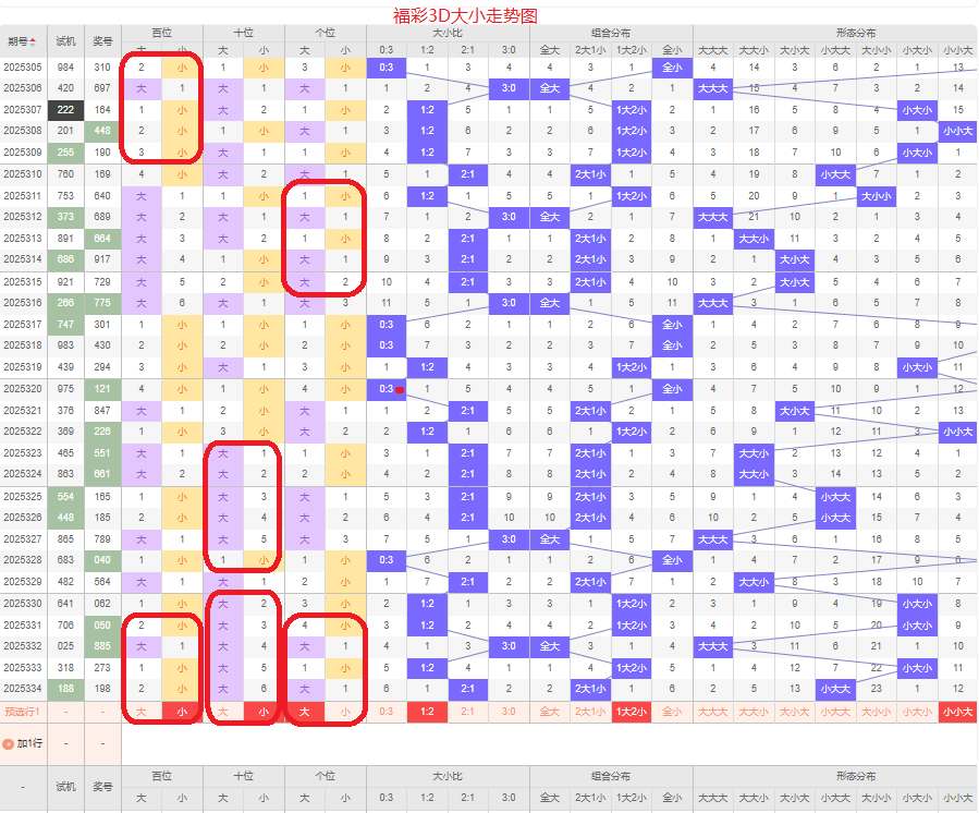 上期大小比为2:1,两大的号码组合方式,从近五期出现情况看,大号码出现8次,小号码出现7次,大小号码出现较平均,本期侧重两小的号码组合,本期百位侧重小号码,十位侧重小号码,个位要侧重看大,侧重小小大或者大小大的号码组合,根据大小做五码定位01234/01234/56789或56789/01234/56789