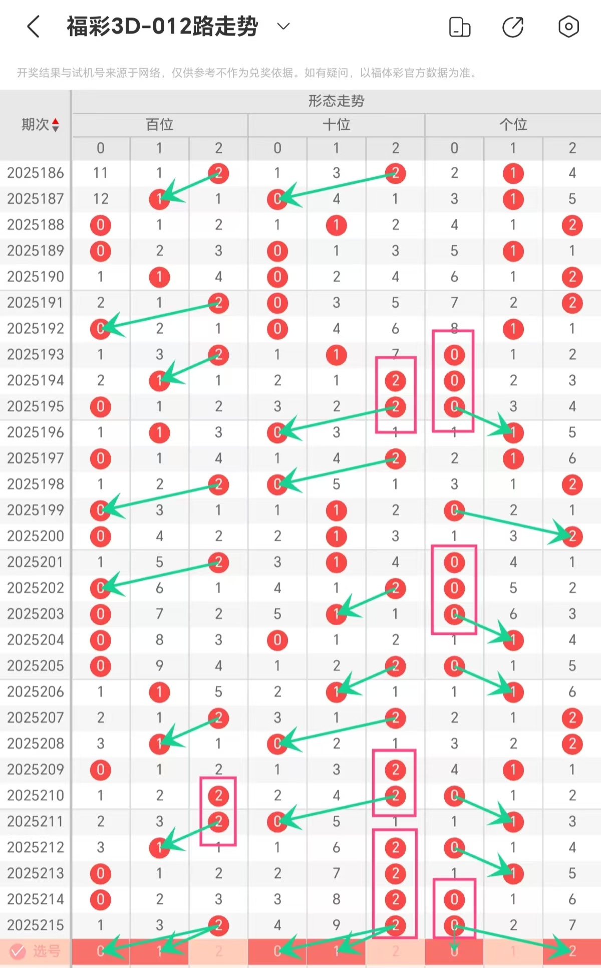 福彩3D中,012路是把0-9这10个数字按除3余数划分,0、3、6、9为0路,1、4、7为1路,2、5、8为2路。以下是对近30期百、十、个位012路形态走势分析