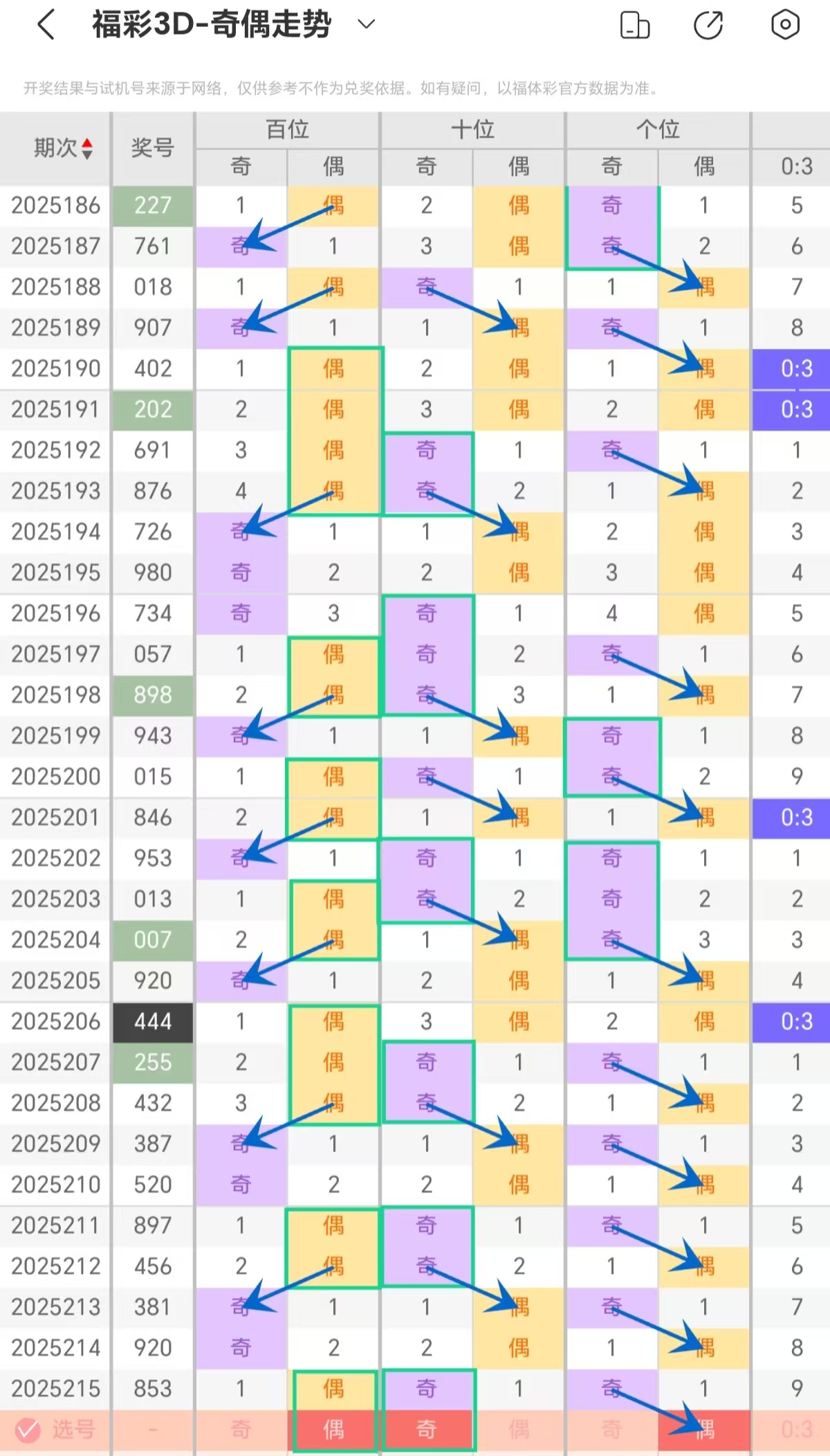 根据上期开出回补奇数分析,十位处,奇偶波动显著,奇数常以连下,偶数借箭头回补打破格局。连下时奇数主导,回补阶段偶数抢占份额,二者交替主导十位,需留意奇数连下后的延续性,以及偶数回补能否形成新周期、打破现有交替节奏,本期参考奇数连下(13579)