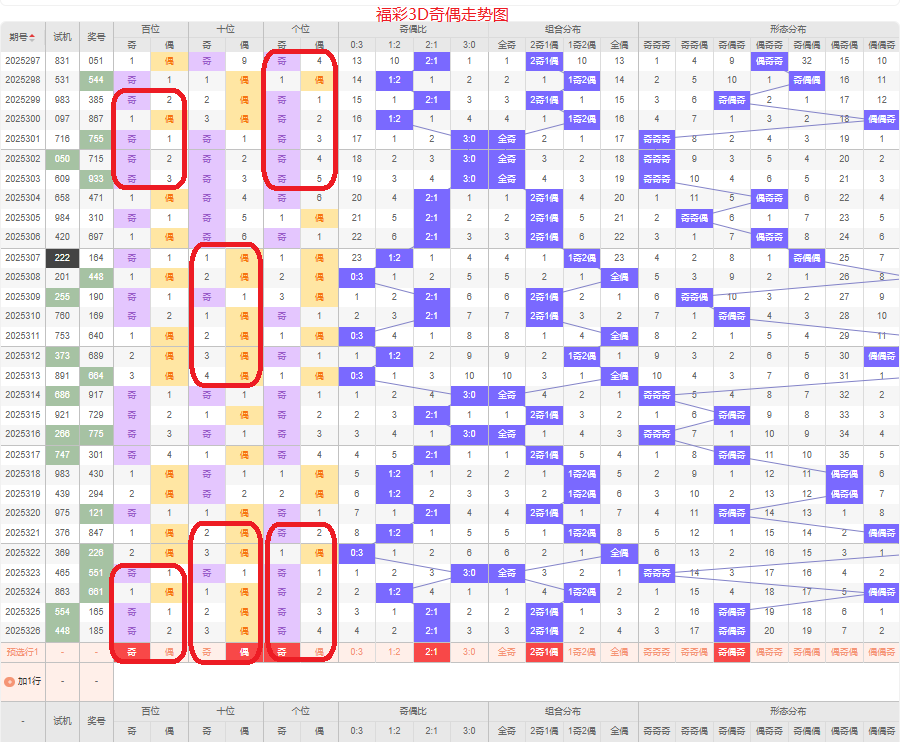 上期奇偶比是2:1,两奇的号码组合方式,从近五期的奇偶数出现情况看,奇数出现8次,偶数出现7次,奇数偶数号码出现较平均,本期侧重两奇的号码组合,侧重奇偶奇或奇奇偶的号码组合方式,根据奇偶形态做五码定位13579/02468/13579或02468/02468/13579