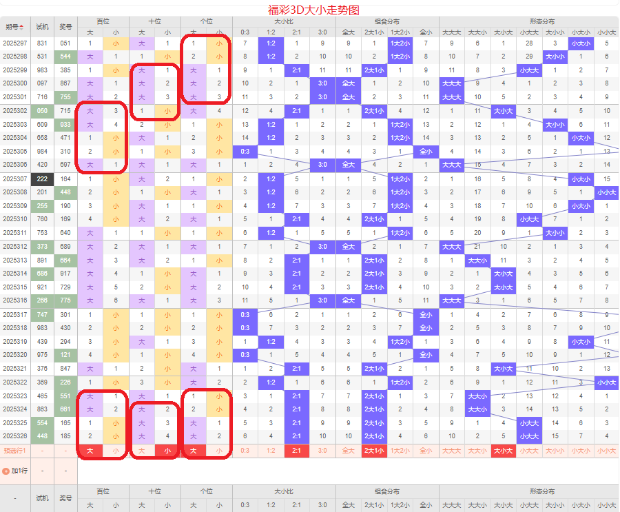 上期大小比为2:1,两大的号码组合方式,从近五期出现情况看,大号码出现9次,小号码出现6次,大号码出现较多,本期侧重两大的号码组合,本期百位侧重大号码,十位侧重小号码,个位要侧重看大,侧重大小大或者小小大的号码组合,根据大小做五码定位56789/01234/56789或01234/01234/56789