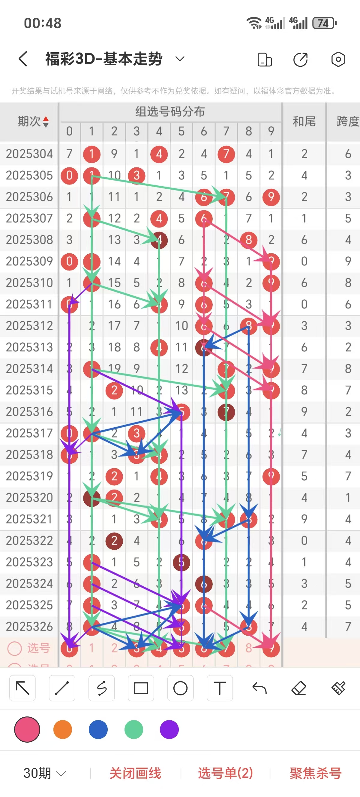 跨度通常情况下在五期之内重复一个跨度的概率很高,近五期重复了4/5的跨度,近五期跨度为4/4/5/5/7,近期12路的跨度较热,上期是1路的跨度,本期要侧重跨度以3/4/5跨为主的号码组合。可以从跨度方面选择相应的双胆码组合,双胆码的选取要根据近期和历史的走势进一步的分析选取。
