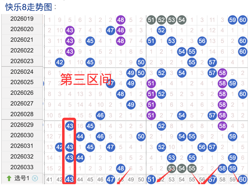 三区间开出了6个奖号(48.53.54.55.58.59)上期回顾三区开出6个奖号上期的三区间的奖号数量呈现一个递增的形态,4头回补1号码,本期先来看号码43近期出现频率相对来说是很稳定。偶尔有时间隔期数也是很长,说明其在近期的开奖中较温热的,号码47在近 30 期内出现次数相对较还是稳定的号码,近期的活跃度也是较。号码51有一定的间歇性,通常间隔5-3期会出现一次,有明显的连续出现态势,走势相对还是很稳定,在整个第三区间的表现本期还是可以防守的。号码60走势相对近期较,近期有连续间隔落号的情况,活跃度近期处于较状态注意防守。