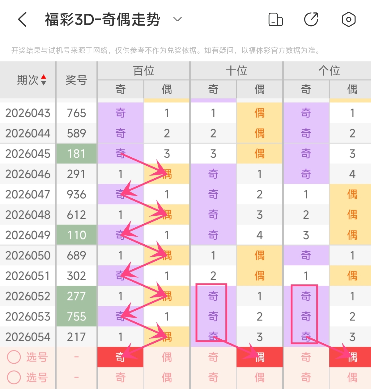 上期奇偶形态为偶奇奇,奇偶比3:0,奇数号码占优,全奇组合。根据近期奇偶形态变化来看,近期奇偶形态变化频繁,而且近期奇偶形态开出奇数号码占优,预计本期奇偶形态会有所变化,而且本期需注意偶数号码的反弹,预计本期奇偶形态会回补偶数号码占优组合。预计本期可关注奇偶比1:2,偶数占优组合 。本期奇偶形态可重点关注:奇偶偶。