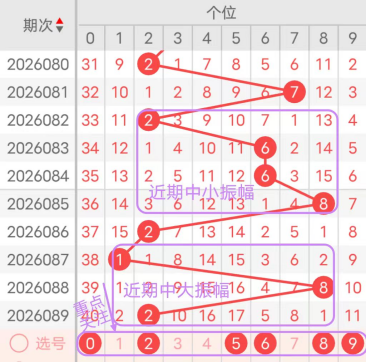 近7期(083~089)开奖号个位号码球分别为6、6、8、2、1、8、2,开奖号与上一期走出的振幅分别为4、0、2、6、1、7、6。083期走出6号中大数号码球,走出“4”的中小幅度,084期走出6号中大数号码球,走出“0”的小幅度,085期走出8号大数号码球,走出“2”的小幅度,086期走出2号小数号码球,走出“6”的中大幅度,087期走出1号小数号码球,走出“1”的小幅度,088期走出8号大数号码球,走出“7”的大幅度,089期走出2号小数号码球,走出“6”的中大幅度;从近期振幅大小的走势及大小走势来看,中大振幅走在6~7之间较为适宜,中小振幅走在0~4之间较为适宜;结合走势图的整体及大小走势分析,本期个位应重点关注号码球为0、2、5、6、8、9。