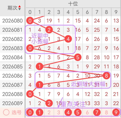 近7期(083~089)开奖号十位号码球分别为0、5、1、8、1、0、2,开奖号与上一期走出的振幅分别为4、5、4、7、7、1、2。083期走出0号小数号码球,走出“4”的中小幅度,084期走出5号中大数号码球,走出“5”的中大幅度,085期走出1号小数号码球,走出“4”的中小幅度,086期走出8号大数号码球,走出“7”的大幅度,087期走出1号小数号码球,走出“7”的大幅度,088期走出0号小数号码球,走出“1”的小幅度,089期走出0号小数号码球,走出“2”的小幅度;从振幅大小及走势图的整体对应来看,中大振幅走在5~7之间较为适宜,中小振幅走在1~3之间较为适宜;结合走势图的上下对应及振幅大小分析,本期十位应重点关注号码球为0、1、4、5、7、9。