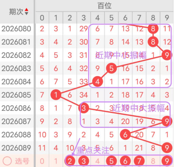 近7期(083~089)开奖号百位号码球分别为5、4、1、3、9、6、9,开奖号与上一期走出的振幅分别为4、1、3、2、6、3、3。083期走出5号中大数号码球,走出“4”的中小幅度,084期走出4号中小数号码球,走出“1”的小幅度,085期走出1号小数号码球,走出“3”的中小幅度,086期走出3号中小数号码球,走出“2”的小幅度,087期走出9号大数号码球,走出“6”的中大幅度,088期走出6号中大数号码球,走出“3”的中小幅度,089期走出9号大数号码球,走出“3”的中小幅度;从振幅大小及走势图的整体形势,中大幅度走在4~7之间较为适宜,中小幅度走在0~3之间较为适宜;结合走势图的整体及大小走势分析,本期百位需重点关注号码球为2、3、5、6、7、9。