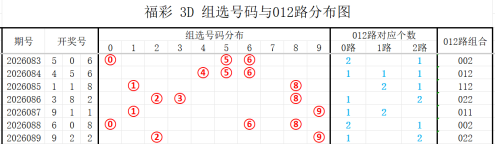 近7期(083~089)开奖号与012路组合分别为506(002)、456(012)、118(112)、382(022)、911(011)、608(002)、922(022),上期开奖号为022路组合,根据整体走势分析,本期看好的012路组合有:012、122、112,防002、001、022组合。