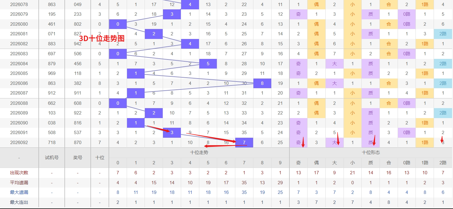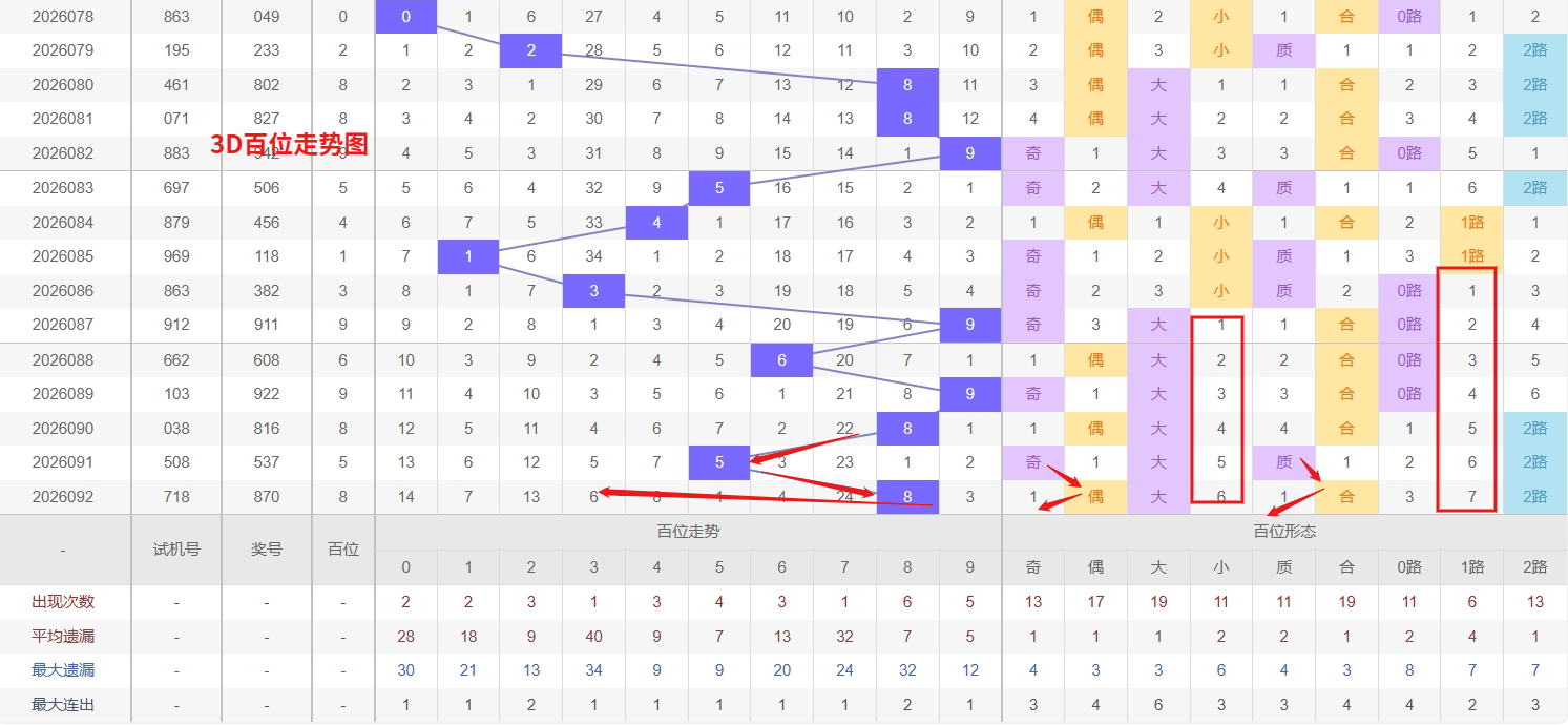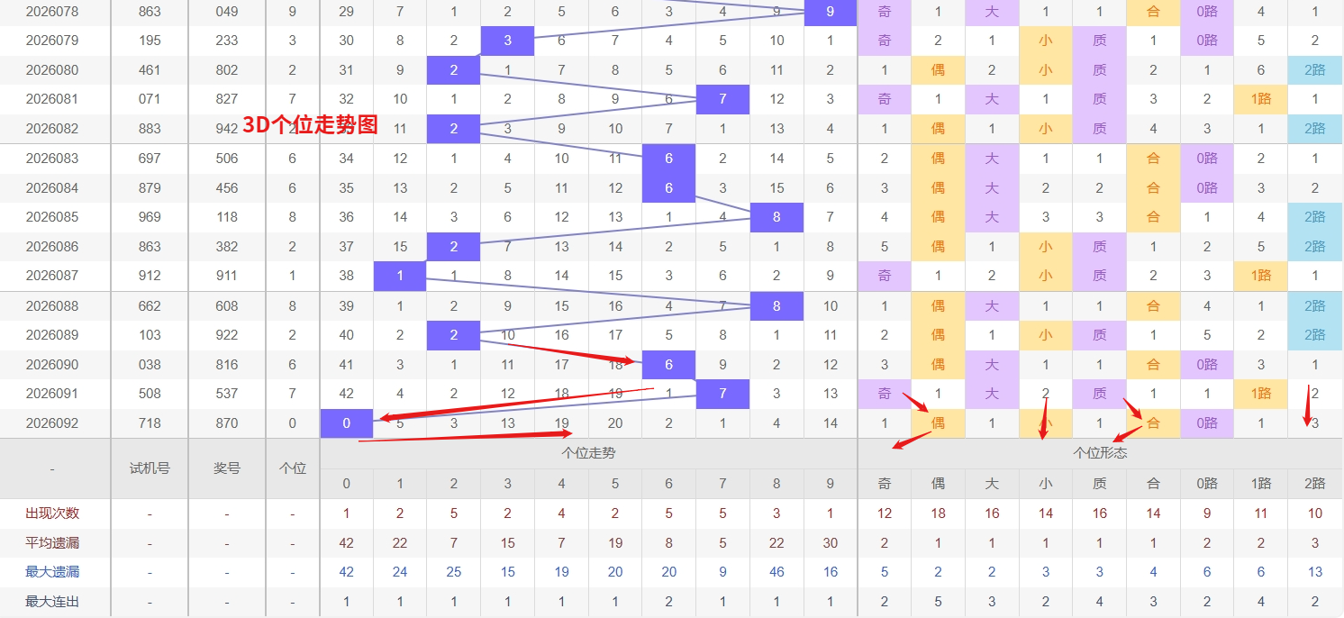 福彩3D个位分析:第2026092期个位开出号码0于小偶数前端,从以上个位走势图中可以看出近100期的大小比约为53:47奇偶比约为54:46大小奇偶数据上有点差异有需求但不是太明显,不太好看这时就要借助连线走势和遗漏数据来帮助我们缩水号码。上期个位落号“0”小偶数0路号码球,号码开出了7振幅,连续多期的小振必被大振幅取代幅符合我们的预期,那么本期我们在个位考虑振幅走势走前依然要转变思路考虑大振幅,具体考虑(1-5)个振幅是我们主要的方向,那么在对个位落号情况进行系统的分析时我们可以明显的看到个位号码走势呈现大范围震荡,尤其是在号码的落位特点上表现的尤为突出,那么本期我们在个位分析时就要注意号码的风险,避免出现踏空。3D个位走势中,数字0虽然刚刚开出,但其此前经历了较长时间的遗漏,冷态积累的反弹动能并不会因为一次出现就完全释放,反而可能开启连下模式,值得重点关注;毕竟长期遗漏后的号码往往具备较强的回补惯性,尤其是在个位这种容易出现重复号码的位置上,0号连续出现的概率并不低。与此同时,数字2作为近期频繁亮相的热号,热度尚未明显减退,在个位当前的出号节奏中依然具备较强的竞争力,不能因为0号的回补预期就忽视了2号的延续性;热号2随时可能再次现身,与冷号0形成双雄争锋的局面。因此福彩3D第2026093期个位看好02359。