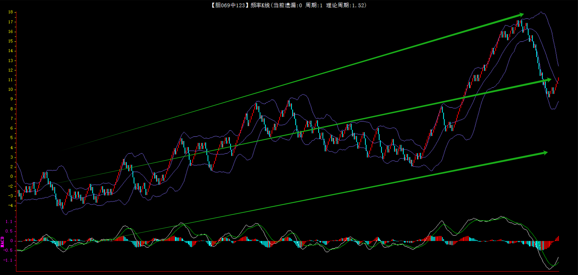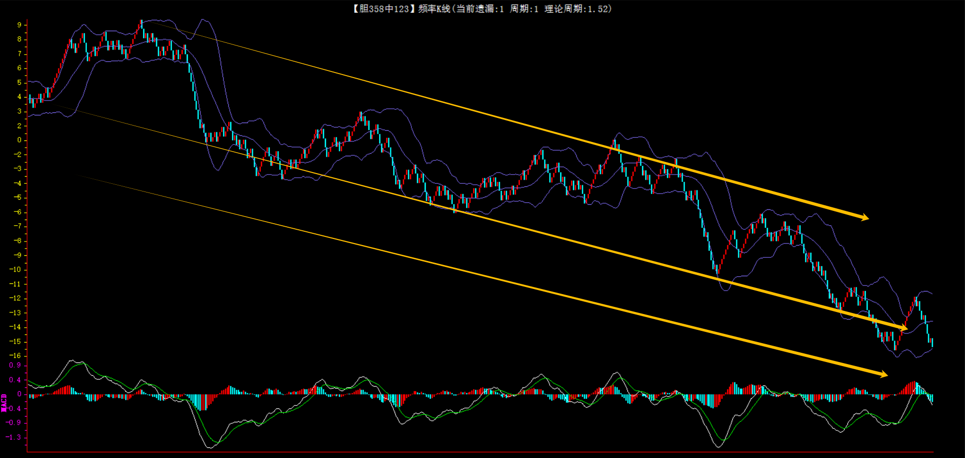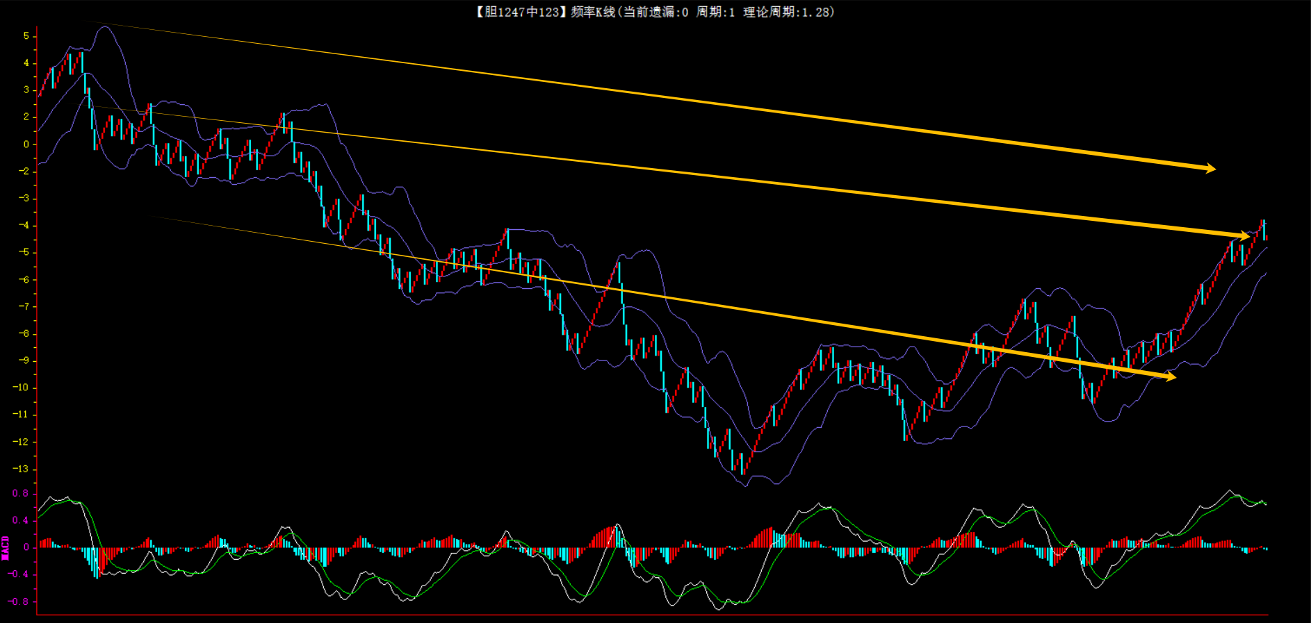 整体趋势下行,上边沿线趋势向下,下边沿趋势也是向下,节点震荡,当前遗漏1期,本期防守。