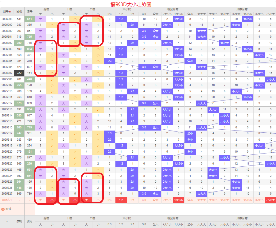 上期大小比为3:0,全大的号码组合方式,从近五期出现情况看,大号码出现11次,小号码出现4次,大号码出现较多,本期侧重两小的号码组合,本期百位侧重小号码,十位侧重小号码,个位要侧重看大,侧重小小大或者大小大的号码组合,根据大小做五码定位01234/01234/56789或56789/01234/56789