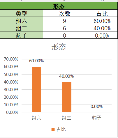 上期开的是组三,各个类型占比没有变化。通过图示可以看到,组六在15期内开了9期,组三开了6期。目前还是组六占比是最优的本期关注组六,防组三