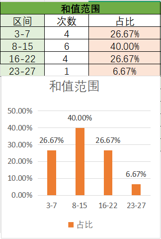 上期和值是4,处在3~7之间,其中16~22占比变小,3~7占比变大。目前是8~15的和值占比是最多的,优势是最好的其次是16~223~7之间,最后是23~27。本期看好和值在8~15之间,其次是16~22